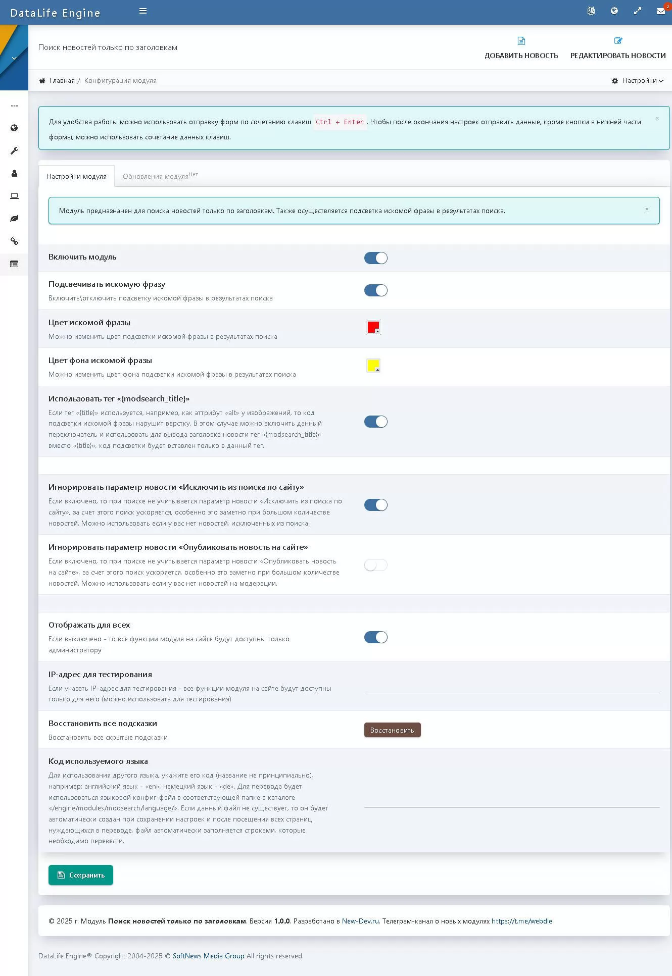 По умолчанию поиск в DLE происходит в заголовках, текстах краткой и полной новости и дополнительных полях. Но иногда требуется поиск новостей только по заголовкам, модуль предназначен для такого режима поиска. Также модуль осуществляет подсветку искомой фразы в результатах поиска. При большом количестве новостей происходит существенное увеличение скорости поиска.