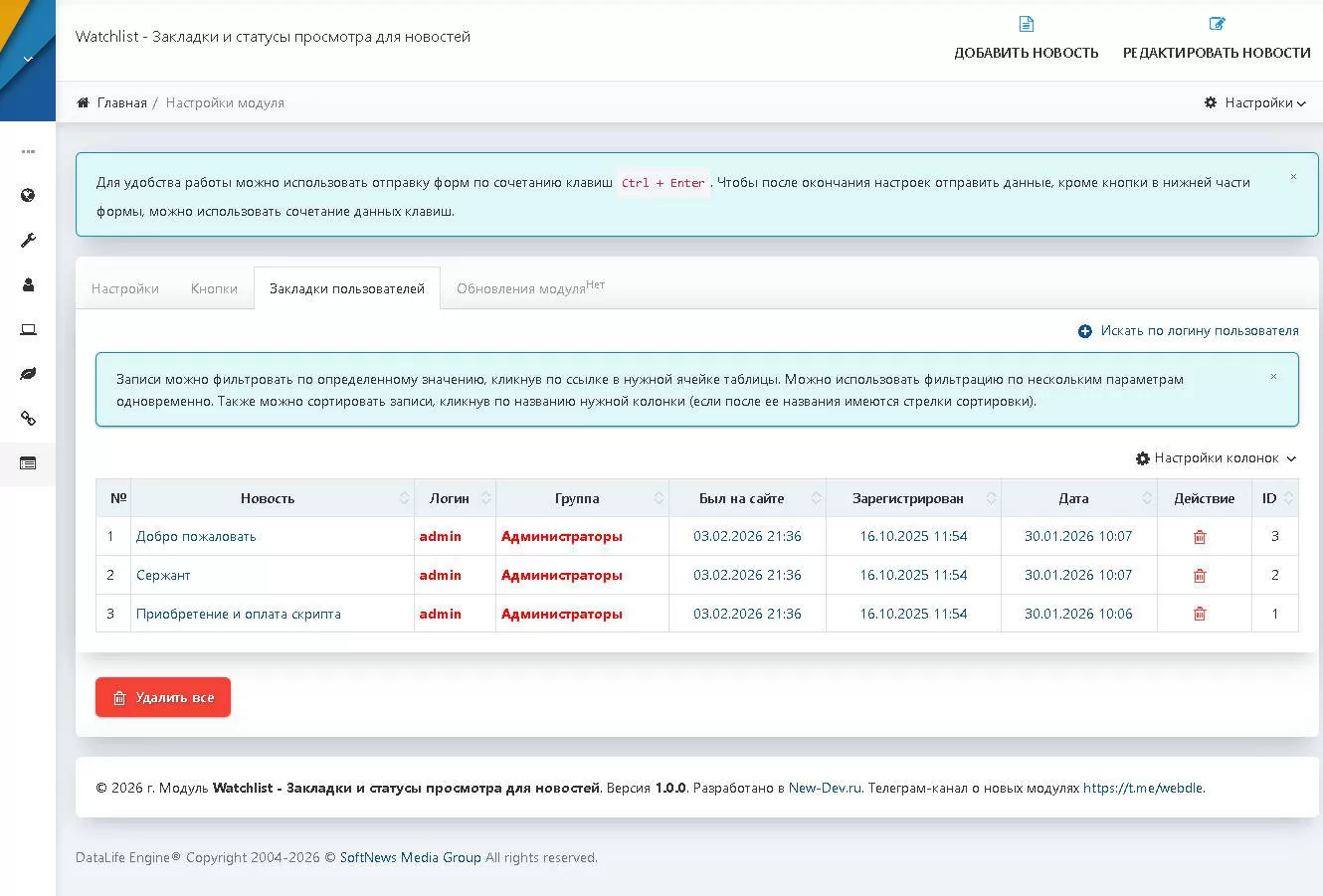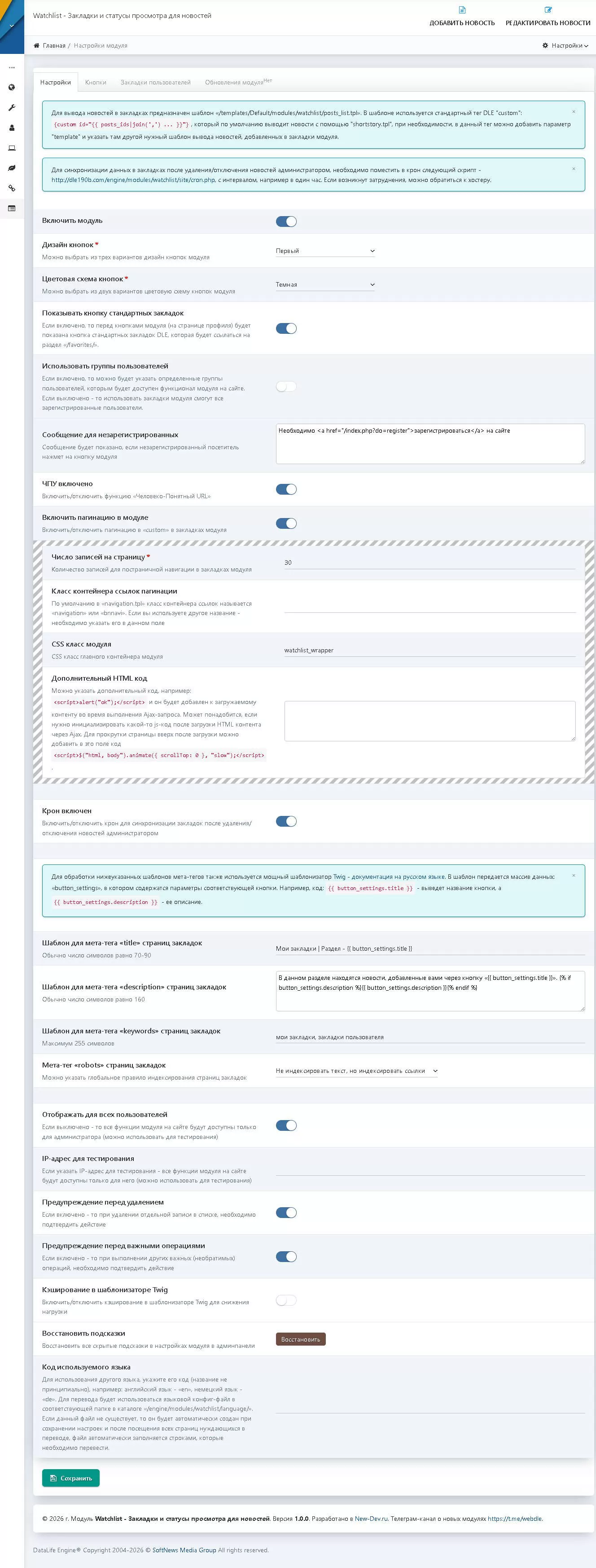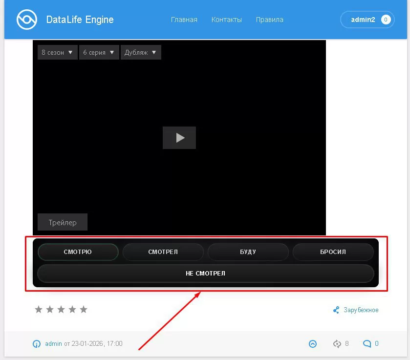 Модуль предназначен для создания закладок зарегистрированных пользователей на сайте для DataLife Engine. Модуль предназначен в первую очередь для киносайтов, хотя можно использовать и для сайтов с другими тематиками. Кнопки "Смотрю", "Смотрел", "Буду", "Бросил", "Не смотрел" можно расположить под плеером и пользователь сможет добавить новость в любой из этих типов закладок модуля. Второй список кнопок модуля можно расположить, например, в профиле пользователя и при переходе через нужную кнопку пользователь увидит новости (фильмы), которые он добавил ранее в закладки.